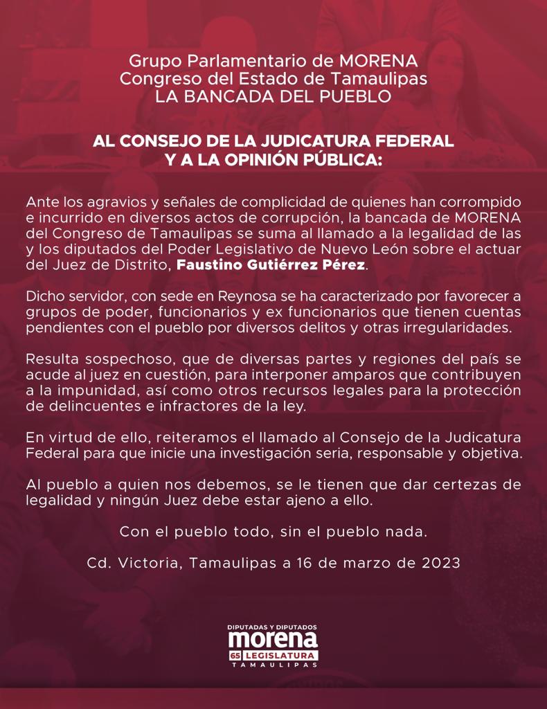 La bancada de MORENA del Congreso de Tamaulipas se une al llamado a la legalidad que han hecho las y los diputados del Poder Legislativo de Nuevo León sobre el actuar del Juez Octavo de Distrito Faustino Gutiérrez López emitiendo un comunicado al respecto que señala que este juez, con sede en Reynosa, ha sido acusado de favorecer a grupos de poder, funcionarios y ex funcionarios que tienen cuentas pendientes con la justicia.