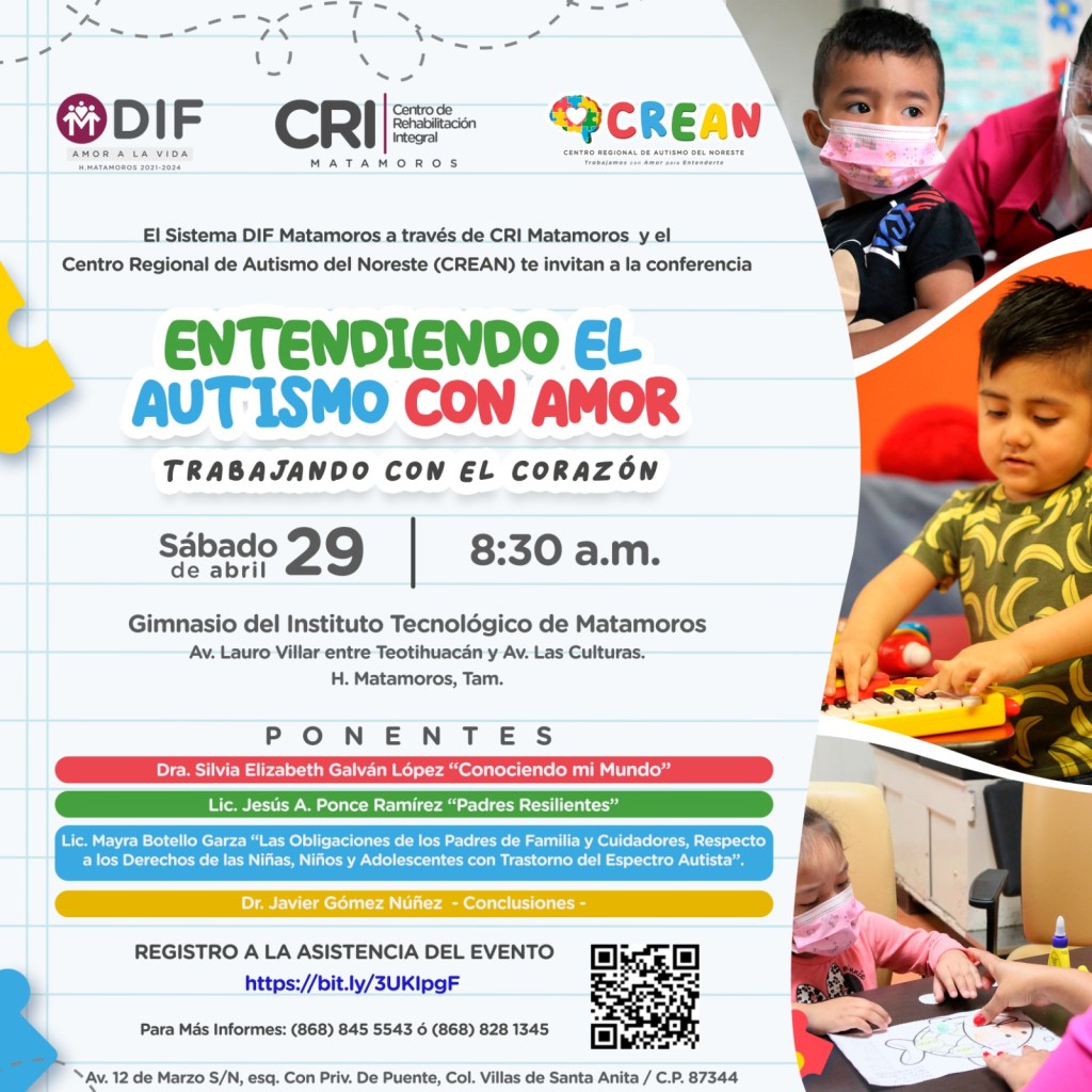 El Sistema DIF Matamoros, en colaboración con el Centro de Rehabilitación Integral (CRI) y el Centro Regional de Autismo del Noreste (CREAN), está invitando a la comunidad en general a la conferencia “Entendiendo el Autismo con Amor, Trabajando con el Corazón”. La conferencia se llevará a cabo el sábado 29 de abril a las 8:30 a.m. en el Gimnasio del Instituto Tecnológico de Matamoros.
