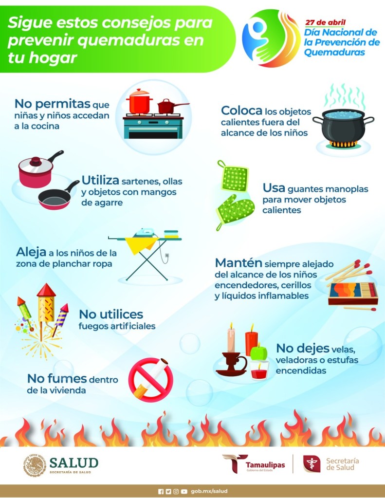 Cd. Victoria, Tamaulipas.- En el marco del día Nacional de la Prevención de Quemaduras, es necesario fortalecer e impulsar acciones que prevengan este tipo de accidentes que afectan principalmente a niñas, niños y adolescentes por lo que la Secretaría de Salud hace un llamado social a madres, padres, cuidadores y maestros a tomar consciencia de lo que esto representa.