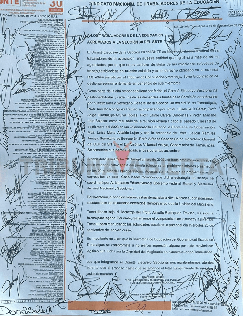 De acuerdo con el comunicado emitido por el Comité Ejecutivo de la Sección 30 del SNTE en Tamaulipas, entidad que «aglutina a más de 65 mil agremiados», se establecieron acuerdos significativos durante una reunión el 18 de septiembre. La cita tuvo lugar en las Oficinas de la Secretaría de Gobernación y contó con la presencia de personalidades como la Mtra. Luisa María Alcalde Luján, Secretaria de Gobernación, y el Dr. Américo Villarreal Anaya, Gobernador de Tamaulipas, entre otros.
