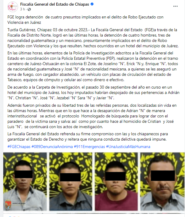 Cuatro supuestos implicados en la desaparición y homicidio de 3 encuestadores del partido Morena fueron detenidos en el municipio de Juárez en Chiapas, por los delitos de Robo ejecutado con violencia y los que resulten.