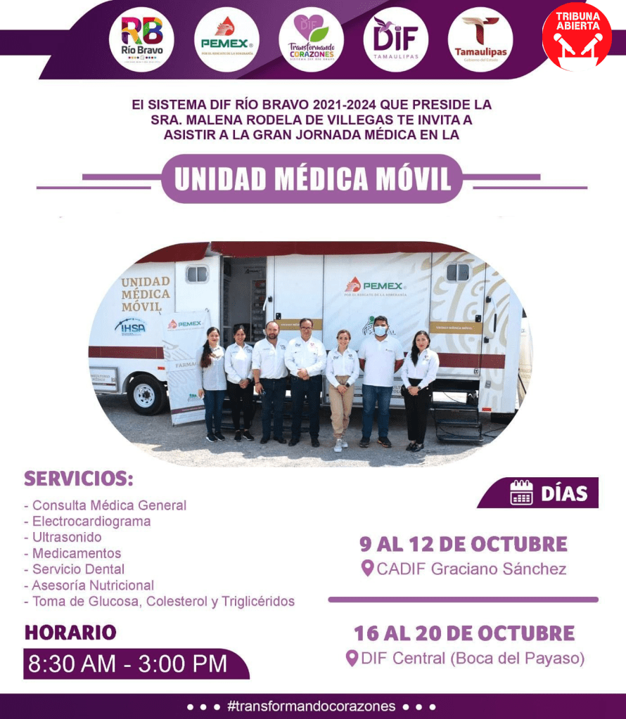 El Sistema DIF Río Bravo y Pemex extienden una cálida invitación a toda la población en general para que asista y aproveche estos beneficios médicos de alta calidad de forma totalmente gratuita. La salud es un activo invaluable, y estas jornadas médicas están diseñadas para brindar atención y apoyo a la comunidad. ¡No pierdas la oportunidad de cuidar tu salud y bienestar!