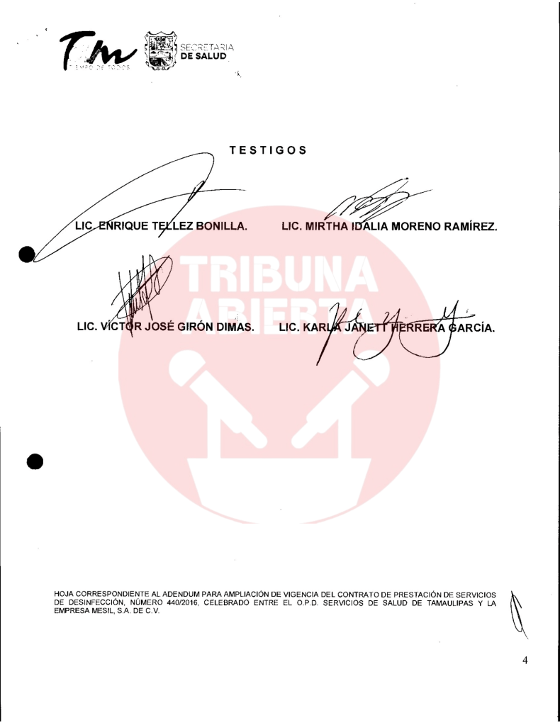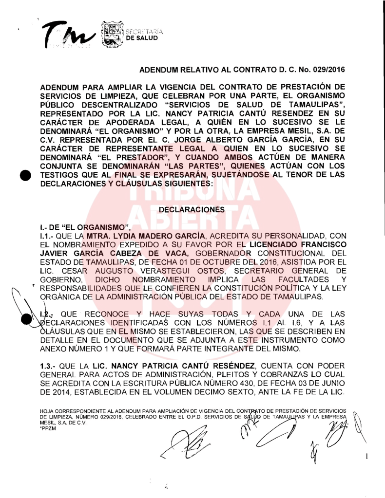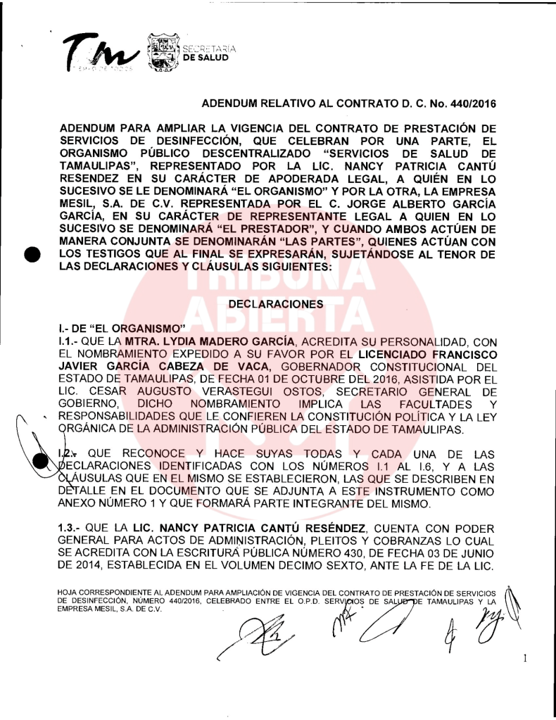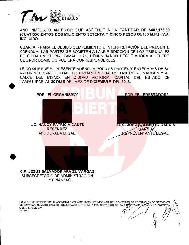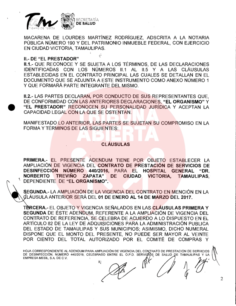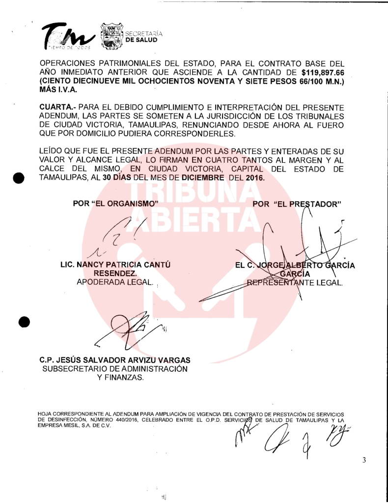 El primer contrato encontrado fue el número 029/2016, recién llegado Cabeza de Vaca se contrató el servicio de limpieza a Mesil, por una ampliación de contrato por $402,175.80 pesos. De igual manera, se encontró otro contrato con el Congreso del estado por $15,664.24 pesos. Un contrato más encontrado fue el 440/2016 por concepto de ADEMDUM PARA AMPLIAR LA VIGENCIA DEL CONTRATO DE PRESTACION DE SERVICIOS DE DESINFECCION por $119,897.66 pesos a la Secretaria de Salud.