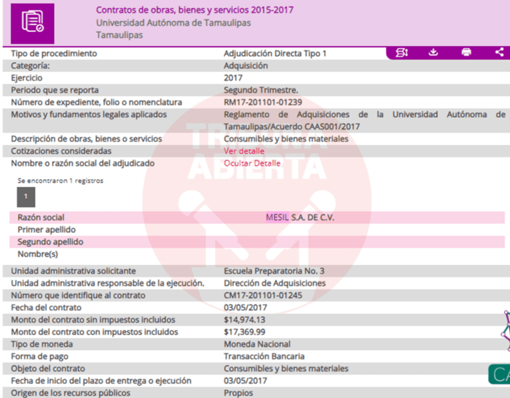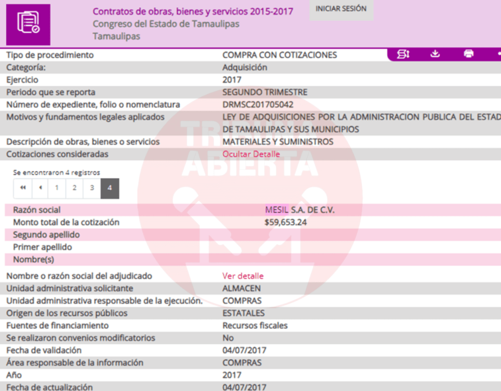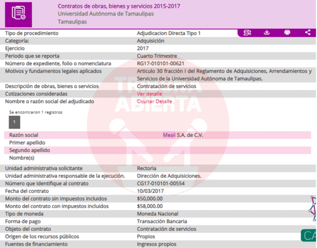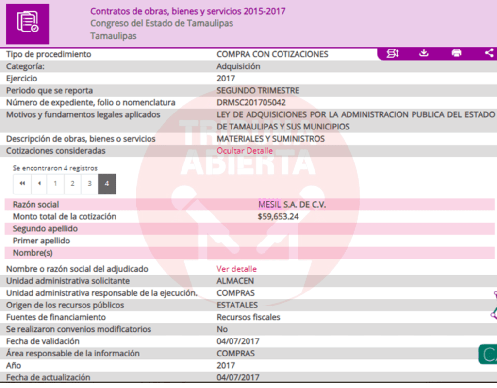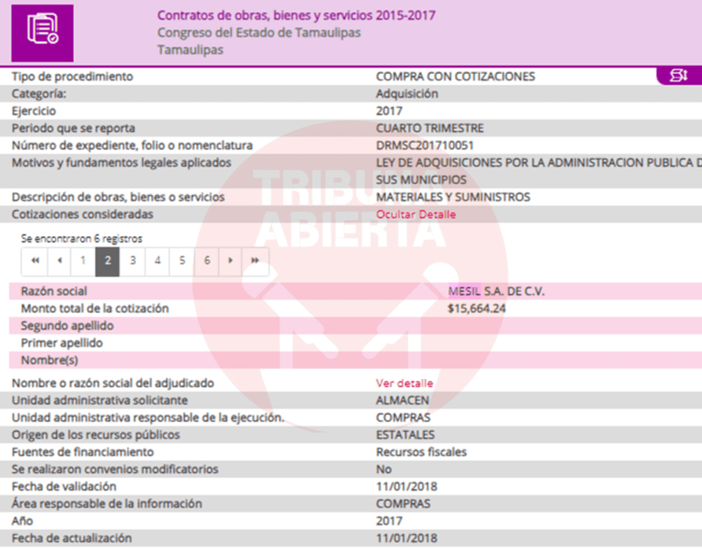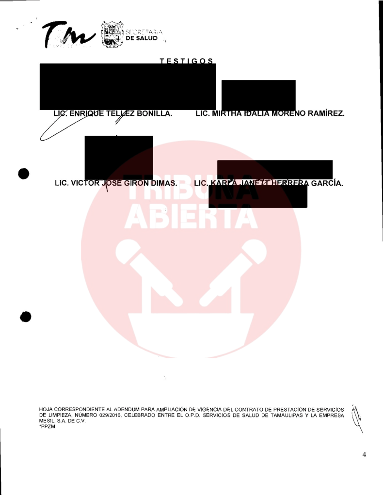 El primer contrato encontrado fue el número 029/2016, recién llegado Cabeza de Vaca se contrató el servicio de limpieza a Mesil, por una ampliación de contrato por $402,175.80 pesos. De igual manera, se encontró otro contrato con el Congreso del estado por $15,664.24 pesos. Un contrato más encontrado fue el 440/2016 por concepto de ADEMDUM PARA AMPLIAR LA VIGENCIA DEL CONTRATO DE PRESTACION DE SERVICIOS DE DESINFECCION por $119,897.66 pesos a la Secretaria de Salud.