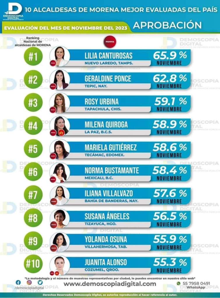 Nuevo Laredo.-En la más reciente evaluación del mes de noviembre de 2023, Lilia Contreras, alcaldesa de Nuevo Laredo y representante del partido Morena, ha destacado como la mejor evaluada a nivel nacional entre diez alcaldesas de dicho partido.