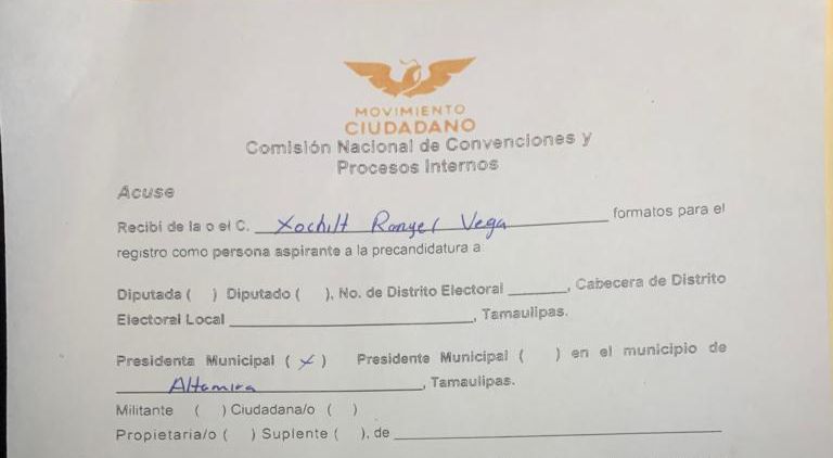 En un paso decisivo hacia el proceso electoral, la líder social destacada de Altamira, Xóchitl Rangel Vega, formalizó su registro el 19 de diciembre ante la Comisión Nacional de Convenciones y Procesos Internos del partido Movimiento Ciudadano. Aspira a convertirse en la precandidata a la presidencia municipal de Altamira en las próximas elecciones.