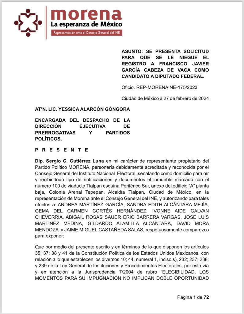 El representante de Morena, Sergio Gutiérrez Luna, presentó pruebas contundentes para que se niegue el registro a Francisco Javier García Cabeza de Vaca como candidato a diputado federal plurinominal por no cumplir con los requisitos de elegibilidad.