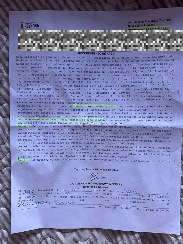 REYNOSA, Tamaulipas — La Dirección de Ingresos de Reynosa ha iniciado cacería contra los deudores del impuesto predial en la ciudad, amenazando a los propietarios mediante oficios que fueron entregados el día de ayer casa por casa en las colonias más abandonadas y carentes de servicios del municipio.