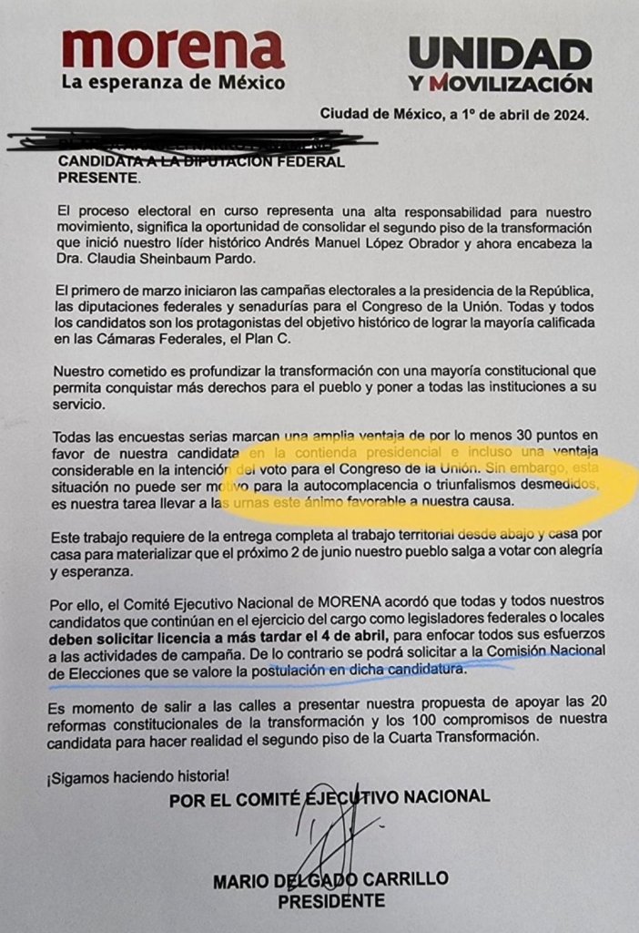 En el documento se estipula que todos los legisladores federales y locales del movimiento deben solicitar licencia a más tardar el 4 de abril para dedicarse de lleno a las actividades de campaña, con la amenaza implícita de que, al no hacerlo, se les retirarán las candidaturas.