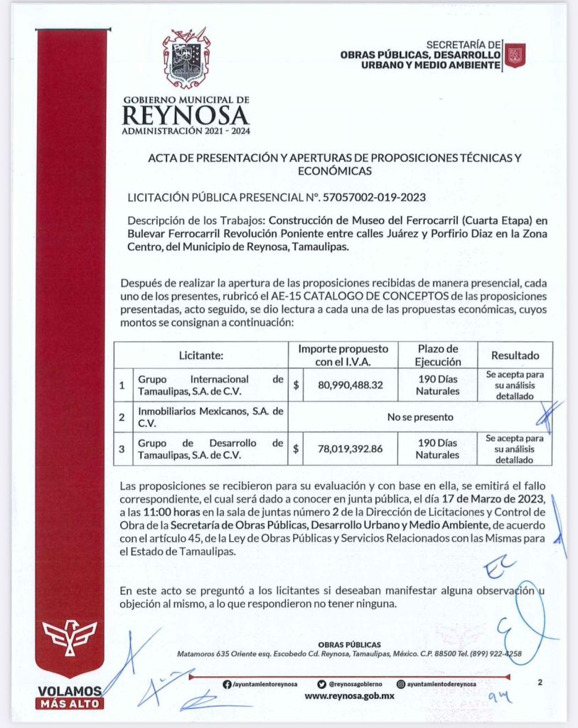 Pese a que su propuesta económica de $80,990,488.32 pesos era la más alta de los 3 licitantes y “misteriosamente” uno de los participantes no se presentó a dejar su propuesta, la empresa familiar del entonces presidente estatal interino del PRI, le ganó la licitación a Grupo de Desarrollo de Tamaulipas.