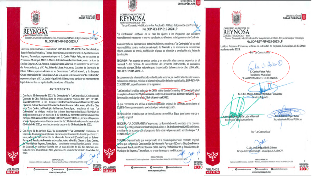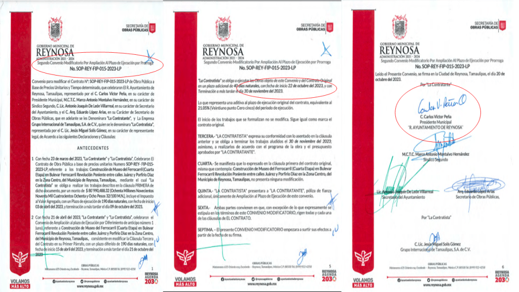 Pero, no pasó ni un mes cuando el 21 de abril del 2023, los contratistas y los contratados firmaron un convenio modificatorio por ampliación al plazo de ejecución por diferimiento del contrato, con la excusa de que el anticipo fue otorgado el 14 de abril del 2023, por lo que no habían podido iniciar en tiempo y forma los trabajos de acuerdo a la fecha estipulada en la cláusula tercera de dicho contrato. La nueva fecha de inicio sería el 15 de abril y finalizaría el 21 de octubre del 2023.