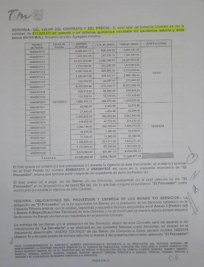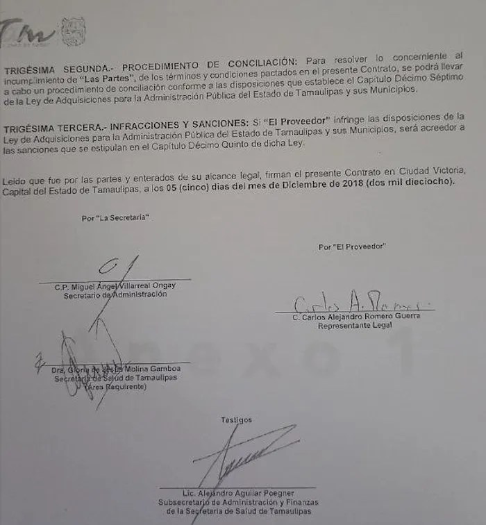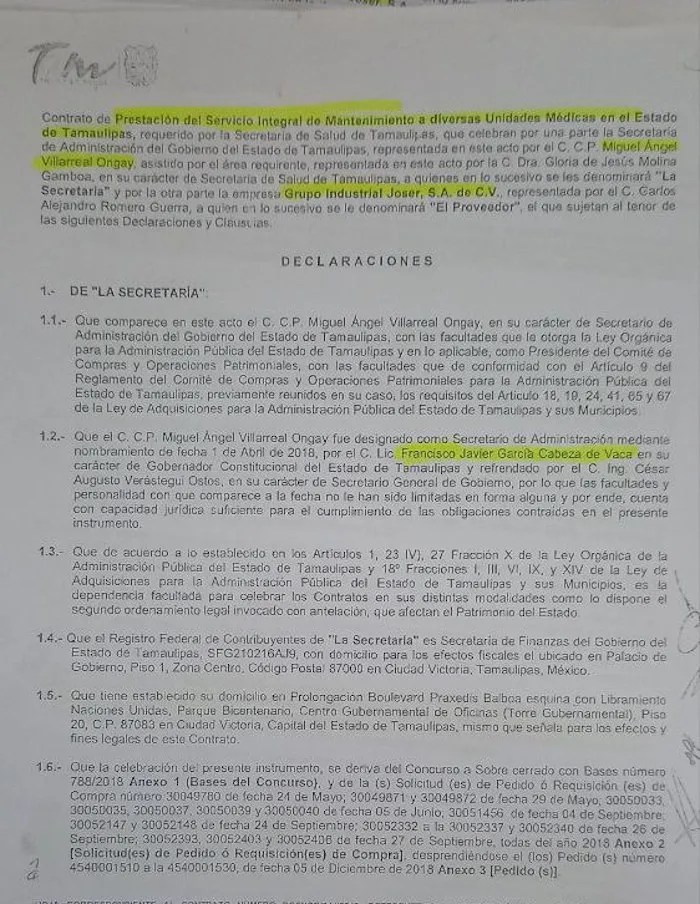 El contrato más jugoso que las empresas de los Carmona Angulo obtuvieron de la administración de Francisco fue de 71 millones 526 mil 577 pesos, con fecha del 5 de diciembre del 2017. Grupo Industrial Joser fue la empresa elegida para la “prestación del servicio integral de mantenimiento” a varias unidades médicas del estado de Tamaulipas.