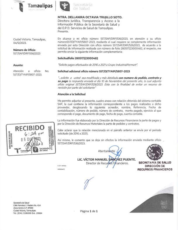 Un contrato más es el C-314-2018 por un monto total de 1 millón 914 mil 550 pesos para el mantenimiento de diversas unidades médicas. Por otra parte, Grupo Industrial Permart recibió entre 2017 y 2018 122 millones 590 mil 087 pesos, en diversos contratos de concursos cerrados. Todos estos datos, fueron parte de la respuesta de la solicitud de información No. 280517223000482.