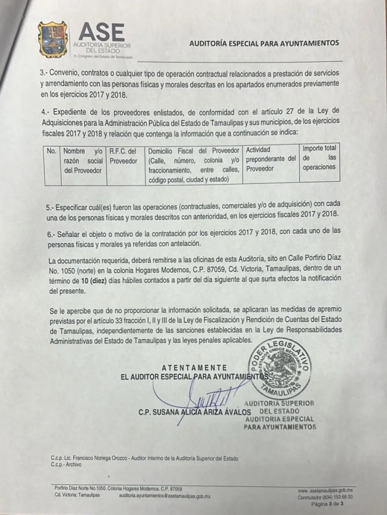 Esto, porque la Auditoría no revisará por encimita como lo hacían en el tiempo del PRIAN sino que el requerimiento al ayuntamiento indica que la información debe ser específica, clara y bien documentada para toda operación contractual, comercial y/o adquisición de operaciones financieras en las que haya interactuado el Ayuntamiento de Victoria y en las que se hayan derivado erogaciones del erario presupuestal local a personas físicas y morales.