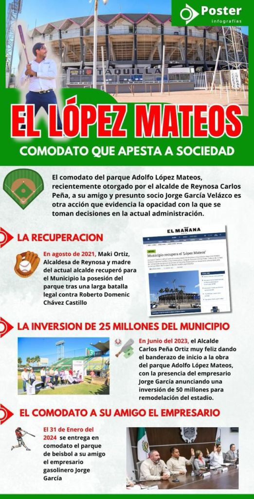El comodato del parque Adolfo López Mateos, recientemente otorgado por el alcalde Carlos Peña, es otra acción que evidencia la opacidad con la que se toman decisiones en la actual administración. En agosto de 2021, Maki Ortiz, Alcaldesa de Reynosa y madre del actual alcalde recuperó para el Municipio el control del parque tras una larga batalla legal contra Roberto Domenic Chávez Castillo, quien tenía la posesión del inmueble.