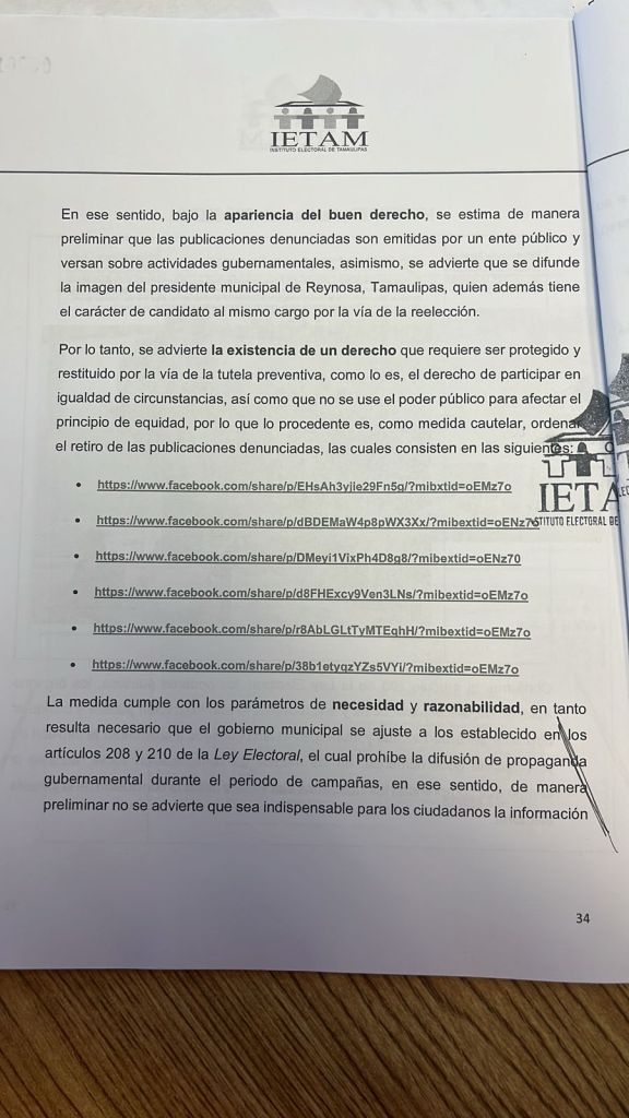 Reynosa, Tamaulipas.- El Instituto Electoral de Tamaulipas (IETAM) dictó medidas cautelares para el candidato y alcalde Carlos Peña Ortiz, una vez que se acreditó el uso de recursos públicos en materia de publicidad a través de la página oficial del gobierno municipal de Reynosa.