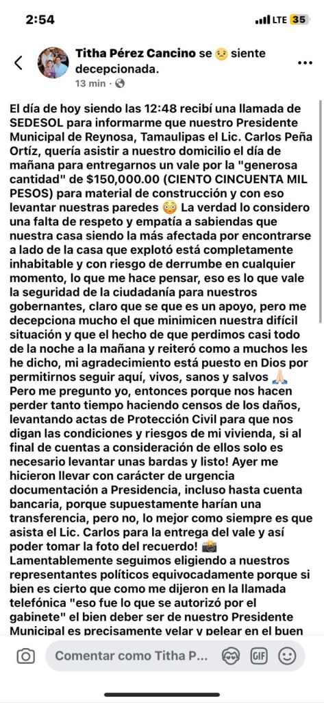 En una carta enviada a medios de comunicación, la señora Tihta Pérez Cansino, propietaria de una de las viviendas que resultaron en pérdida total por el estallido, expresó su indignación, pues aseguró que el municipio le anunció que solo recibiría 150 mil pesos como ‘apoyo’ para la reparación de su hogar colapsado.