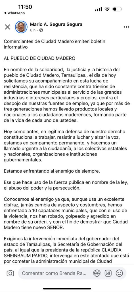 Exigimos la intervención inmediata del gobernador del estado de Tamaulipas, la Secretaría de Gobernación del país, al igual que la presidenta de la república CLAUDIA SHEINBAUM PARDO, intervenga en este atentado que está por cometer la administración municipal de Ciudad Madero.