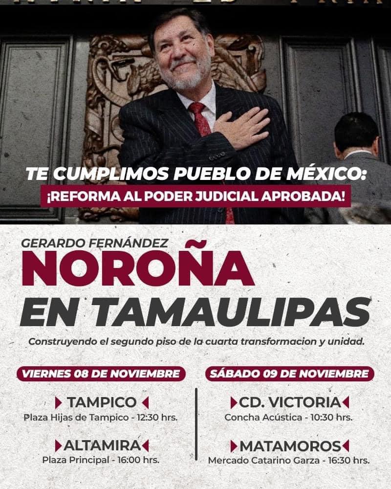La gira, que se llevará a cabo los días 8 y 9 de noviembre, incluirá eventos en las ciudades de Tampico, Altamira, Ciudad Victoria y Matamoros. Durante estas actividades, los legisladores dialogarán con los ciudadanos para presentar los cambios propuestos en el Poder Judicial y su relevancia en el fortalecimiento de la justicia en México.