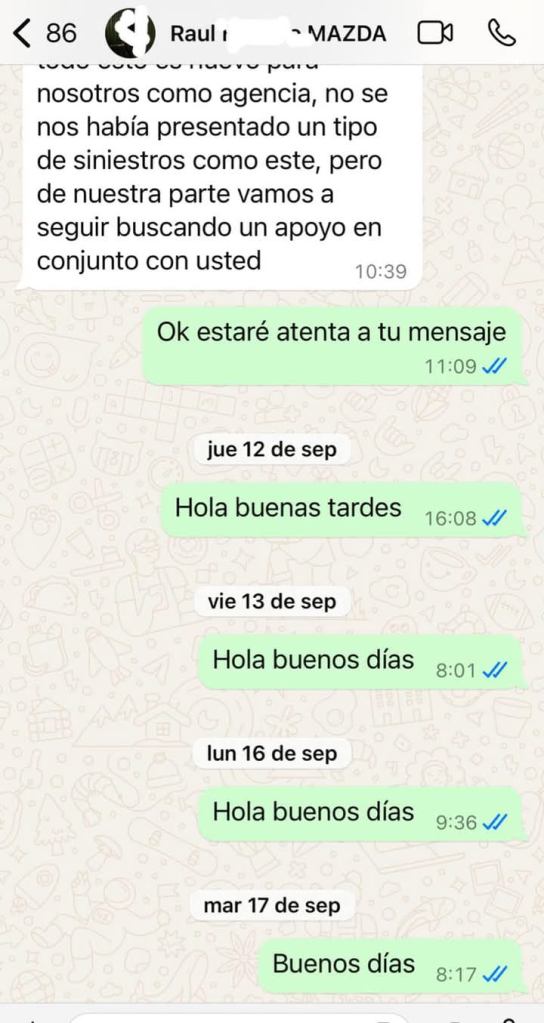 Aunque el seguro respondió oportunamente al incidente, la agencia Mazda Reynosa mostró una actitud omisa y evasiva. Mondragón detalló que intentó contactar al gerente en varias ocasiones, pero nunca obtuvo una respuesta satisfactoria. Además, señaló que la agencia ha evadido las audiencias de conciliación programadas por la Procuraduría Federal del Consumidor (Profeco), donde actualmente lleva su caso.