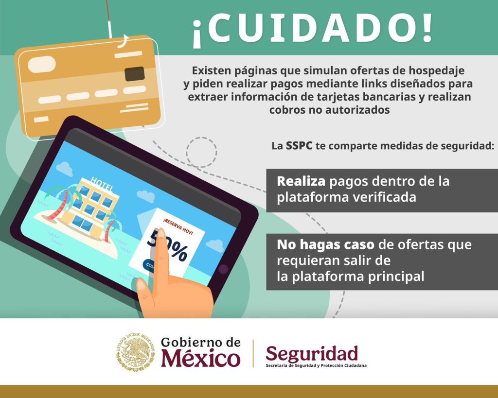 Durante el periodo vacacional por temporada decembrina, la Secretaría de Seguridad y Protección Ciudadana (SSPC), a través de la Dirección General de Gestión de Servicios, Ciberseguridad y Desarrollo Tecnológico, alerta a la ciudadanía sobre sitios web y aplicaciones falsas que ofrecen servicios de hospedaje, y emite recomendaciones para evitar ser víctimas de fraude.