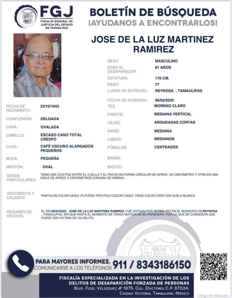 Reynosa, Tamaulipas.— José de La Luz Martínez Ramírez, empresario de 81 años y residente de Mission, Texas, fue encontrado sin vida en Reynosa, Tamaulipas, luego de haber sido reportado como desaparecido el pasado jueves 6 de febrero.