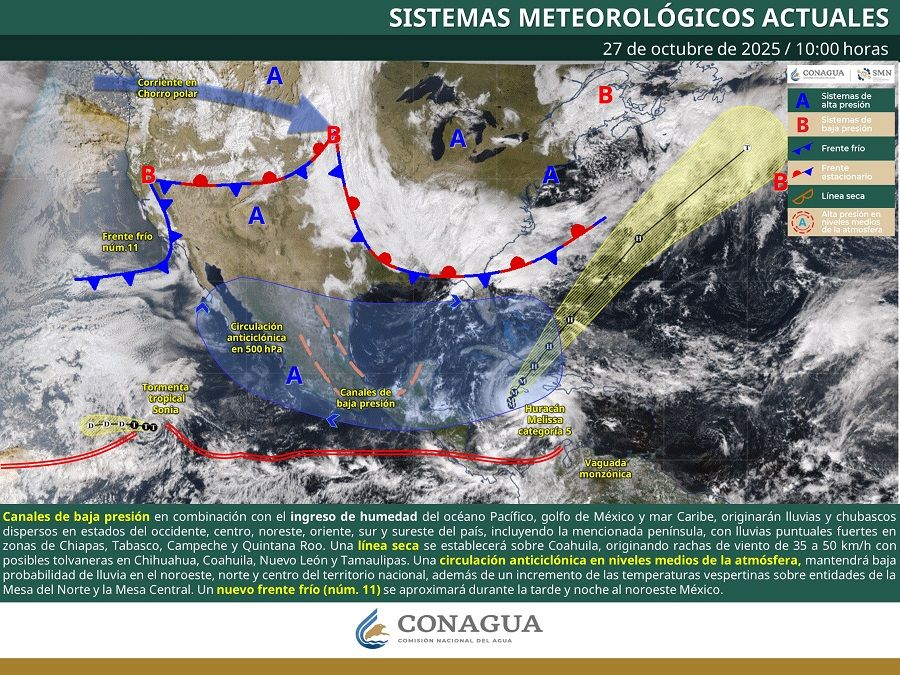Asimismo, la dependencia advirtió que entre el 27 y el 29 de octubre podrían registrarse condiciones de “Norte” de intensidad fuerte a muy fuerte en el litoral de Tamaulipas y Veracruz, así como en el Istmo y Golfo de Tehuantepec. También se esperan vientos intensos y lluvias en los estados de Tabasco, Campeche, Yucatán y Quintana Roo.