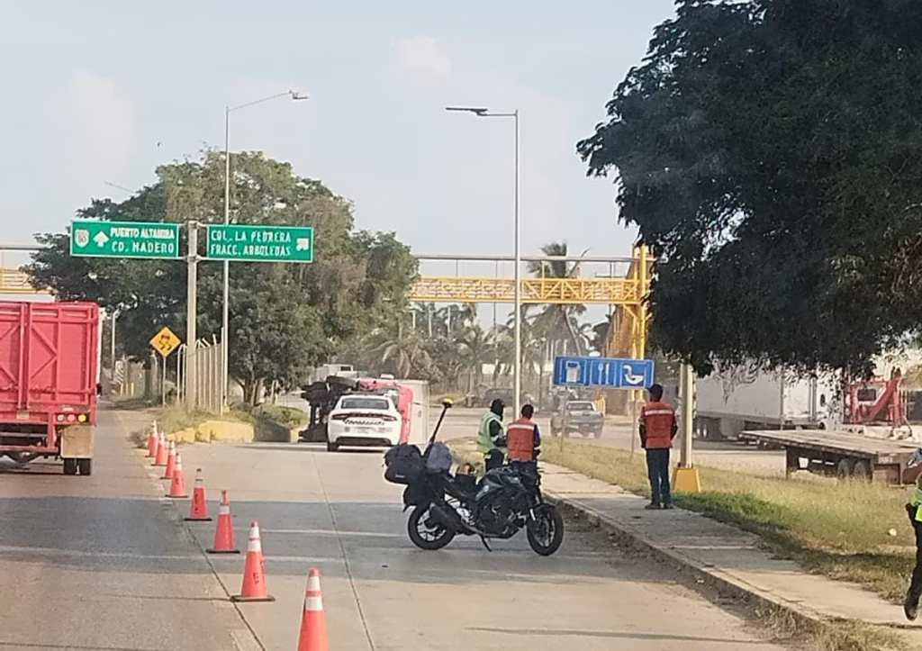 La pesada unidad, que circulaba rumbo al puerto industrial de Altamira, perdió el control por causas aún no esclarecidas y terminó recostada sobre uno de sus costados, obstruyendo parcialmente la vialidad.