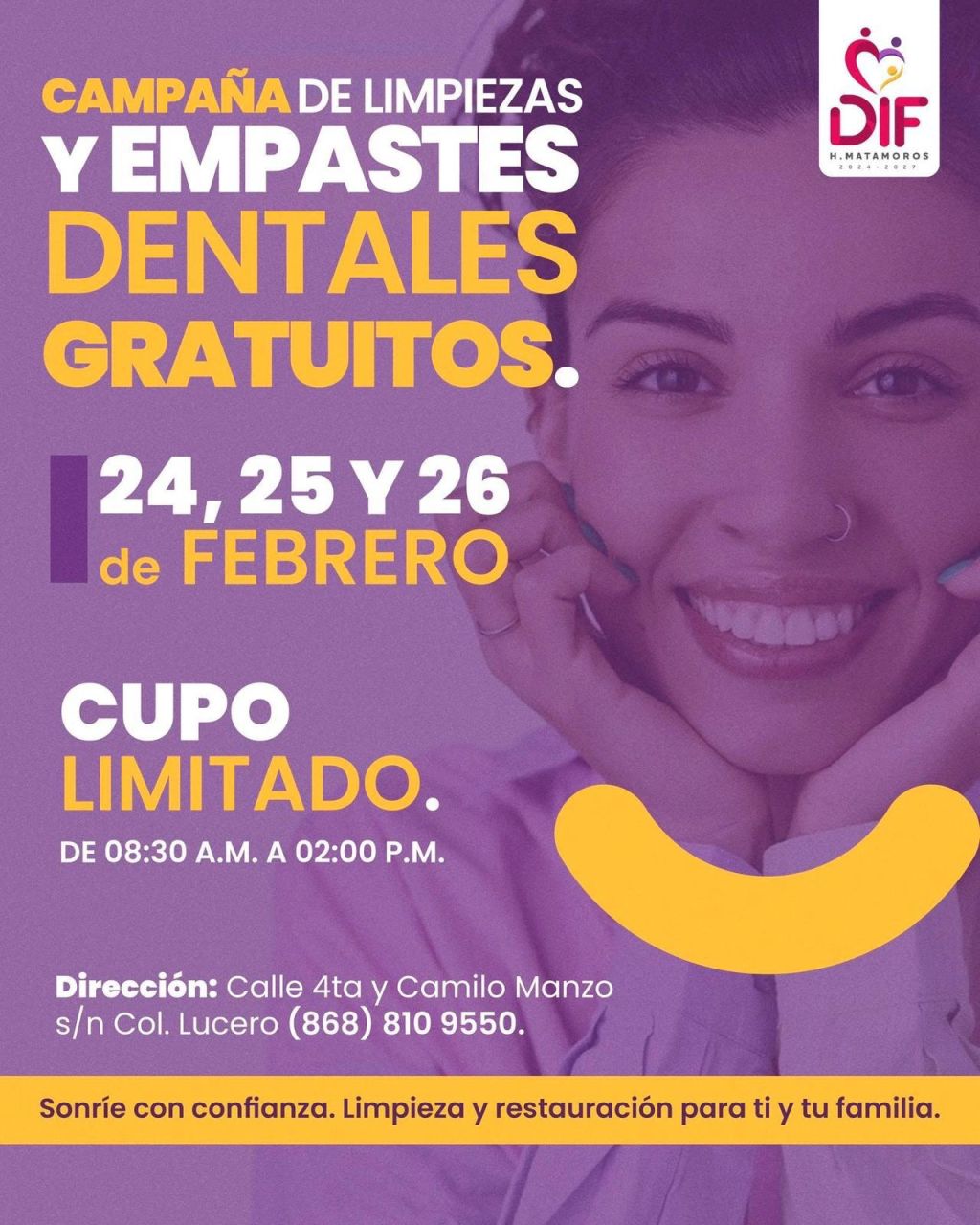 La campaña se llevará a cabo en las instalaciones de la Oficina Central del DIF Matamoros, ubicadas en Calle 4ta. y Camilo Manzo s/n, Col. Lucero, los días 24, 25 y 26 de febrero, en un horario de 08:30 a.m. a 2:00 p.m.