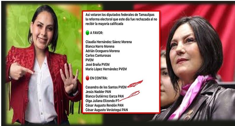 Y las diputadas del Partido Verde y del Partido del Trabajo que votaron en contra de la reforma, ya todo mundo sabe que fueron, las aliadas de Maki Ortiz: de Río Bravo, Casandra de los Santos Flores, y de Reynosa, Olga Juliana Elizondo. Y los cuatro restantes que votaron en contra están justificados porque son del PAN. Ahí no hay vuelta de hoja.